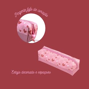 Estojo Escolar Decorado Fofo Rosa Coração Zíper Colorido - BRW