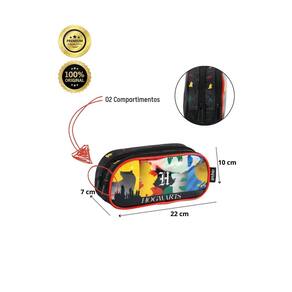 Estojo Duplo Harry Potter: Confeccionado em Poliéster Fechamento em zíper 2 compartimentos espaçosos Design exclusivo Medidas aproximadas: Altura: 10 cm Largura: 7 cm Comprimento: 22 cm CUIDADOS: - Guarde em um local seco e arejado evitando locais úmidos. - Evite colocar excesso de peso no produto para não forçar os zíperes e costuras. - Proteja os objetos cortantes e/ou pontiagudos evitando o contato direto com o produto. - Evitar altas temperaturas. - Cores claras poderão manchar quando em contato com outros objetos ou roupas de cores pigmentadas.