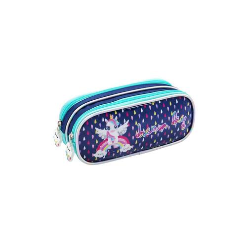 Dois confeccionado em Poliéster Fechamento em zíper Compartimentos espaçosos Design exclusivo Medidas aproximadas: Altura: 10 cm Largura: 7 cm Comprimento: 22 cm CUIDADOS: - Guarde em um local seco e arejado evitando locais úmidos. - Evite colocar excesso de peso no produto para não forçar os zíperes e costuras. - Proteja os objetos cortantes e/ou pontiagudos evitando o contato direto com o produto. - Evitar altas temperaturas. - Cores claras poderão manchar quando em contato com outros objetos ou roupas de cores pigmentadas.