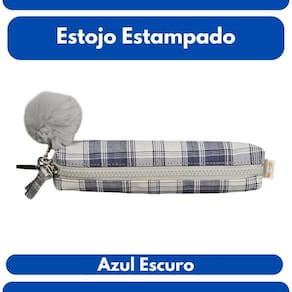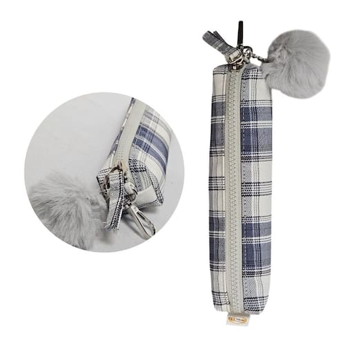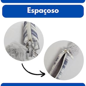 Estojo Escolar Xadrez Azul com Pompom Fofo Multiuso Organização Colorido Material Lápis Caneta Aula