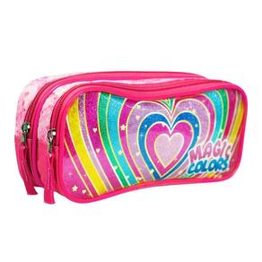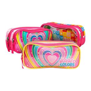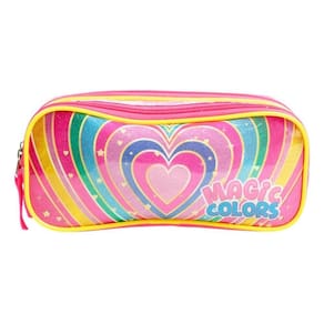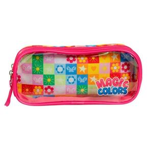 Características Adicionais: Duas divisorias Puxador de tecido Frente em PVC transparente Possui duas divisórias para organização O fechamento é feito por zíperes cor-de-rosa com puxadores de tecido O design é colorido com estampas variadas de flores e formas geométricas A frente é feita de PVC transparente, facilitando a visualização do conteúdo interno