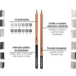 Produzido a partir de madeira de cedro e outras matérias primas selecionadas, o lápis GRAPHITE tem mais durabilidade, traços precisos e intensos. O corpo hexagonal proporciona mais conforto no uso do material. A laca no corpo indica a intensidade do traço. O estojo de graduações do Lápis Graphite vem em uma lata elegante e prática, e permite diferentes traços e nuances conforme as graduações: Tire o branco do papel!