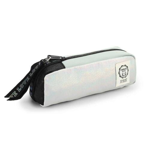 Estojo feito com material metalizado holográfico 55% poliéster e 45% PVC. O modelo possui puxadores personalizados e chaveiro removível.