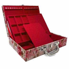 Maleta estojo dupla grande organizadora de jóias, confeccionada em material MDF não em papelão com revestimento externo em couro sintético e interno com tecido aveludado de 1 linha, fazendo seu produto ter maior durabilidade valorizando e protegendo suas peças com estilo. Contém: - Espelho pequeno medidas aproximadas 16cm x 12cm ;- Espuma em corte H com suporte para aproximadamente 32 anéis;- Placa organizadora para aproximadamente 105 pares de brincos;- Aproximadamente 18 suportes para pulseiras ou correntes;- 9 quadriculados medidas aproximadas 5cm x 6,5cm para demais jóias;- 9 quadriculados medidas aproximadas 11cm x 7cm para demais jóias;- Fecho cromado com suporte para cadeado;- Alça cromada. Marca: De Carvalho Jóias