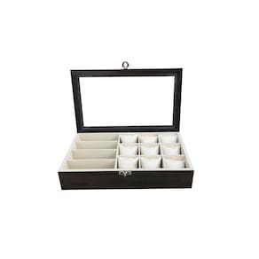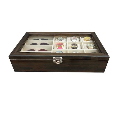 Prático e luxuoso, na linha madeira maciça encontrarmos um toque vintage, objeto decorativo onde são visíveis os veios naturais da madeira. Nossos estojos irão facilitar seu dia a dia com a organização e segurança que sua coleção precisa, além de proporcionar um ambiente mais sofisticado e elegante.Produzida com madeira natural de reflorestamento. Escolhida rigorosamente, totalmente tratada, tingida e envernizada externamente. Internamente, inclusive as divisórias são revestidas com nylon aveludado e as almofadas que acompanham o produto, normalmente são também em tecido aveludado. Na linha madeira maciça é possível observar os veios naturais da madeira. As dobradiças não são aparentes e possuem um limitador. A tampa possui visor com vidro transparente. Acompanha um fecho giratório de pressão em metal, ideal para colocar cadeado. Seus relógios sempre bem protegidos e acomodados confortavelmente, com toda segurança e facilidade no manuseio. Características da caixa:- Produto fabricado em madeira maciça de qualidade,- Não empena,- Ébano flocado de bege- Revestimento interno aveludado, inclusive as divisórias,- Fecho giratório de pressão em metal suporta cadeado ,- Tampa de vidro 2 mm,- Acompanha almofadas nos casulos para Relógio.- Porta óculos- Medidas aproximadas dos casulos para Relógio larg x comp x alt : 7,5 x 7,5 x 7,0 cm.Relógios e óculos não acompanham o estojo - Imagens meramente ilustrativas
