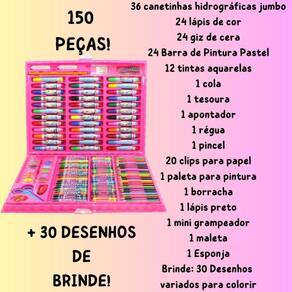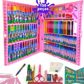 Kit Completo em Maleta Resistente: O conjunto contém 150 peças, incluindo lápis de cor, canetinhas hidrográficas, giz de cera, tintas aquarelas, régua, borracha, apontador, tesoura e muito mais Tudo isso é organizado em uma maleta resistente e fácil de transportar, para que você possa levar seus materiais de arte para onde quiser.