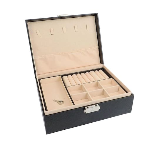Valorize ainda mais sua coleção de joias. Estojo porta joias, feito de madeira e revestido externamente de PU e internamente de flanela. Costura em tom branco, dando mais elegância aos seus relógios. Acomodam perfeitamente e com segurança, pulseiras, brincos, colares e anéis. Seu fecho prateado é muito bonito e reforçado, não deixando que o estojo se abra em qualquer descuido e com chave. Tamanho do estojo : 8 cm X 23 cm X 17 cm.