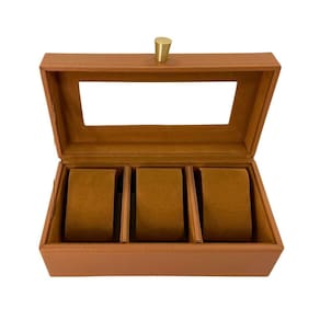 Valorize ainda mais sua coleção de relógios. estojo para 3 relógios, feito de madeira e revestido externamente PU e internamente de camurça. acabamento sofisticado, dando mais elegância aos seus relógios. acomodam perfeitamente e com segurança, relógios femininos ou masculinos. tamanho do estojo para 3 relógios: 20 cm X 10 cm X 8 cm. com tampa em plástico super reforçado com aparência idêntica ao vidro. são 3 almofadas distribuídas em casulos devidamente separados por repartições em camurça. cada casulo 6cm X 8,5 cm , vem acompanhado de uma almofada de camurça para acomodar e proteger o relógio