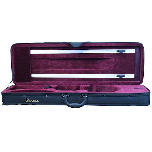 Estojo retangular térmico para violino preto interior vinho Estojo térmico retangular para violino 4/4 Externo confeccionado em nylon. Acabamento interno veludo. Espaço para 2 arcos. Espaço para espaleira. Compartimento interno para acessórios. Bolso externo para transportar partituras. Alças de mão e alças tipo mochila removíveis. Acompanha lenço da cor do estojo para proteger o instrumento.