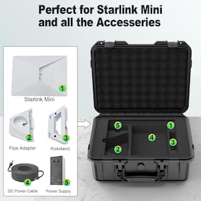 Capa rígida à prova d'água serve para Starlink Mini Dish Kit, espuma de corte preciso para Starlink Mini, suporte, adaptador de tubo, fonte de alimentação, cabos, cabos Ethernet e mais, espuma durável de choque de camada dupla - [Grande capacidade] Capa rígida à prova d'água serve para mini prato Starlink, fonte de alimentação Starlink, cabo de alimentação DC, cabo Ethernet, suporte de suporte e adaptador de tubo, bolso pequeno extra para acessórios. - Interior de espuma personalizada: a espuma é de polietileno de grau militar que pode ser limpo se estiver sujo e não absorve água, óleos ou outros líquidos. - Características da capa: a capa manual é 100% à prova d'água e à prova de poeira, a capa é resistente e enviável, aprovada por companhias aéreas, válvula de purga para mudar de altitude, Starlink, seus acessórios/periféricos e cabo ethernet não estão incluídos. - Dimensões da capa: 45 cm C x 35 cm L x 20 cm A - Capa rígida à prova d'água serve para Starlink Mini Dish Kit, espuma de corte preciso para Starlink Mini, suporte, adaptador de tubo, fonte de alimentação, cabos, cabos Ethernet e mais, espuma durável de choque de camada dupla