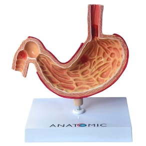 Modelo de estômago patológico em corte mediano, evidencia estrutura anatômica como: esôfago, corpo do estômago, parede muscular, canal gástrico, membrana mucosa, artéria gástrica, nervos e duodeno. Desenvolvido para estudo e demonstração, o modelo apresenta patologias que acometem o estômago sendo: esofagite, úlcera gástrica e úlcera duodenal. Confeccionado em PVC, montado sobre base.