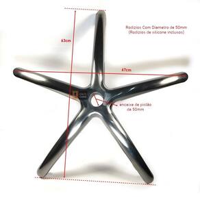 Produto com qualidade Peso Max. Recomendado: 110 kg Classificação: Giratória; com rodízios Modelo: Nacional Medidas: Expressas especificamente na última imagem do anuncio. Encaixe do Pistão: 50mm Diâmetro do Rodizio: 50mm Encaixe do Rodizio: 11x20mm Modelo rodízios: Rodizios de Silicone 50mm Estrutura: Aluminio Cor: Aluminio Para: Maioria dos modelos de cadeira de escritório giratória, atendendo desde modelos secretários até modelos presidentes, gamers, devido ao seu raio que é um dos maiores do mercado.