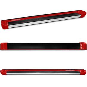 Fabricado em aluminio de alta qualidade e resistência e ponteiras em plástico injetado ABS , com pintura automotiva na cor Vermelho Alert de alto padrão, além de acabamento lateral cromado em aço inox.