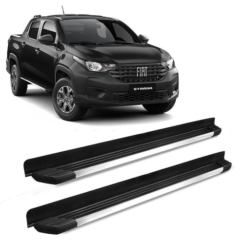 Estribo fabricado em Alumínio, com suas ponteiras em poliuretano, cujo materia de excelente qualidade conhecido pela sua alta resistência e durabilidade, possuindo acabamentos na cor preta deixando a sua Fiat Strada com um visual ainda mais completo.