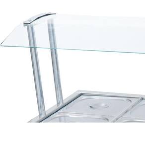 Esta estufa buffet conta com corpo e banho-maria fabricados inteiramente em aço inoxidável 430, proporcionando maior durabilidade ao carro buffet. Seus pés são cromados, confeccionados com tubos inteiros, livre de solda em sua base. Possui cobertura de vidro curvo inteiro de 4 mm, para melhor visibilidade e higiene ao servir as refeições. Além disso, o carro buffet aquecido possui 8 cubas quentes 1/2 feitas em aço inox e de acordo com o padrão mundial Gastronorm.