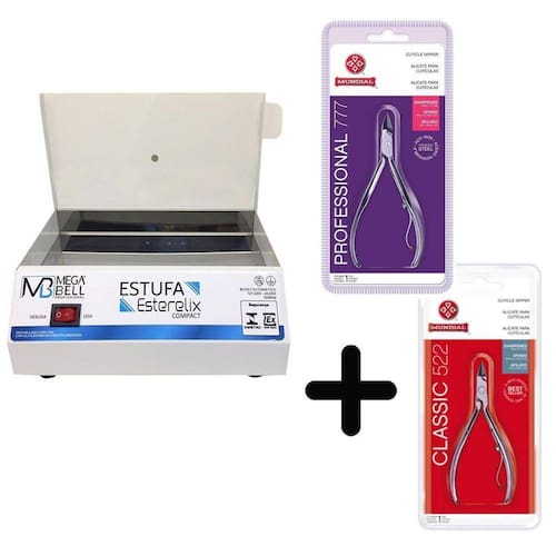 Super kit estufa esterelix megabell + 1 alicate mundial mod. 522 e 1 alicate mundial mod. 777Detalhes da estufa:A estufa para manicure mega bell é um equipamento portátil esterilizador de alicates e instrumentos de aço inox, destinado ao uso doméstico. Foi desenvolvida para atingir uma temperatura de 170c e permanece a esta temperatura por todo o tempo em que estiver ligada.Capacidade de 3 a 4 alicates.Voltagem: aparelho bivolt automático 127v/240v Este aparelho é bivolt automático, ou seja, pode ser ligado tanto em 110v como em 220v sem risco de queimar.Modelo: estufa compactDimensões: 150mm l x 75mm a x 200mm cPeso: 900grPotência: 50wattsTemperatura: 0/170ºcFabricante: mega bellDetalhes dos alicates:Os alicates profissionais mundial são leves e resistentes. São feitos em 100% aço inox com excelente acabamento e podem ser esterilizados. Possuem cabo anatômico, mola suavizadora com tensão ideal e lâminas curvas em formato anatômico que proporcionam um corte preciso.Itens inclusos:-1 estufa para manicure compact branca - bivolt-1 alicate profissional mundial mod. 522-1 alicate profissional mundial mod. 777Fabricante: mega bell e mundial