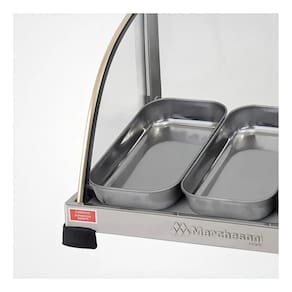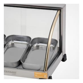 Estufa para salgados com 3 bandejas em aço inox, sistema de aquecimento com termostato automático, conservação ideal dos alimentos com consumo de energia eficiente.Luz de calor residual