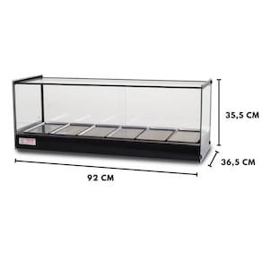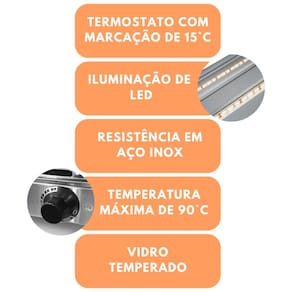 A estufa EVR LP acompanha iluminação led, com perfil de alumínio anodizado em aço inox e bandejas com dobras em aço inox. Todos os vidros temperados e com termostato ideal para seu negocio.
