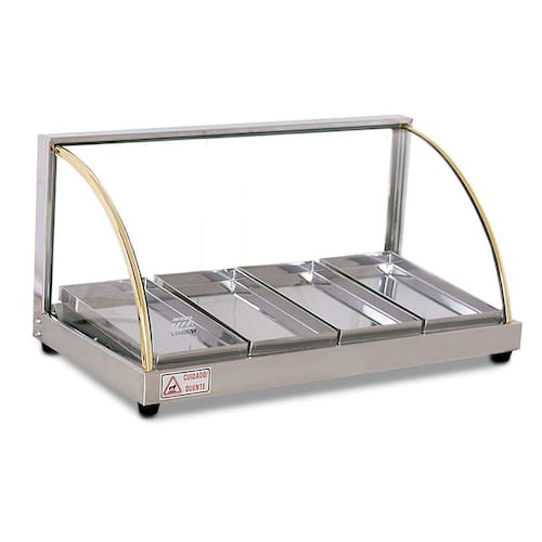Uma excelente opção econômica para seu estabelecimento. Fabricada toda em inox, com acabamento e bandejas internas em aço inox brilhante. Possui resistência blindada e termostato para controle de temperatura, cada marcação do termostáto representa aproximadamente uma temperatura de 15 C. Todos os vidros são temperados. Perfeita para expor seus alimentos de forma elegante. Não possui iluminação.