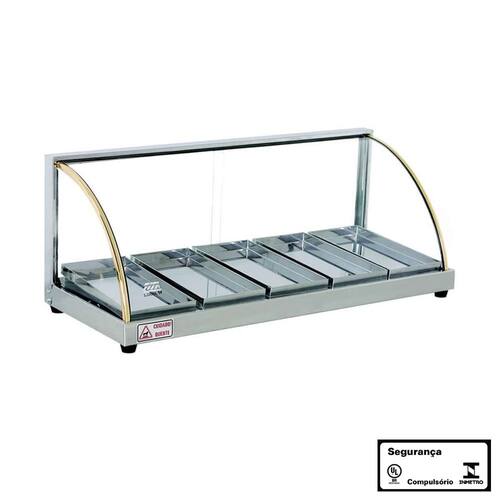 Quantidade de bandejas: 5 Tensão: 220 V Corrente: 2,27 A Potência: 500 W Frequência: 50/60 Hz Comprimento: 78 cm Largura: 34 cm Altura: 32 cm Dimensões das Bandejas CxLxA: 14x28x2 cm Aço inox brilhante Bandeja em aço inox Porta em vidro transparente Resistência blindada Termostato Vidro transparente