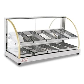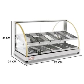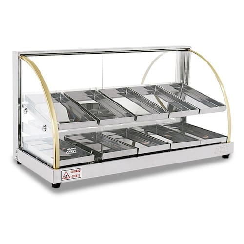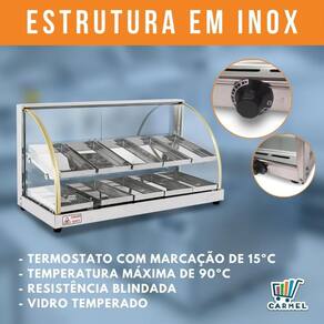 Uma excelente opção econômica para seu estabelecimento. Fabricada toda em inox, com acabamento e bandejas internas em aço inox brilhante. Possui resistência blindada e termostato para controle de temperatura, cada marcação do termostáto representa aproximadamente uma temperatura de 15 C. Todos os vidros são temperados. Perfeita para expor seus alimentos de forma elegante. Não possui iluminação.