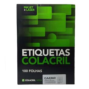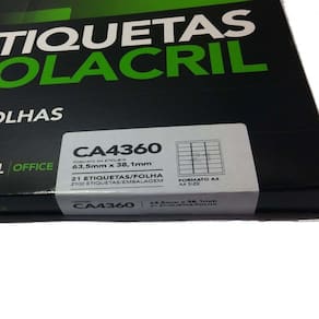 Etiqueta A4 CA4360 63,5x38,1mm Colacril 100 Folhas Etiqueta Auto-Adesiva disposta em folha no formato A4 adequada para impressora : Ink-Jet e LaserQuantidade De Colunas Por Folha:03 ColunasQuantidade De Etiqueta Por Folha:21 EtiquetasMedida:63,5mm X 38,1mm X 3 colunasEmbalagem:Código CA4360 : Caixa com 100 folhas / 2100 etiquetas na embalagem.