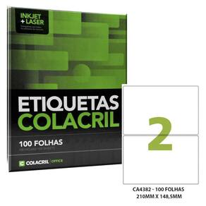 Etiqueta Adesiva A4 CA4382 210 x 148,5mm 100 Folhas Colacril Etiquetas indicadas para impressoras inkjet e laser de uso doméstico ou corporativo.Etiqueta Auto-Adesiva disposta em folha no formato A4 adequada para impressora : Ink-Jet e Laser - Coluna Por Folha: 01 Colunas- Etiqueta Por Folha: 02 Etiquetas- Medidas: 210 mm x 148,5 mm - Código: CA4382 Embalagem: 100 FolhasEtiqueta por embalagem: 200 Etiquetas