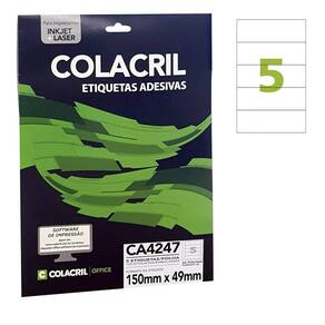 Etiqueta Adesiva Colacril A4 CA4247 150x49mm 25Fls As etiquetas Colacril podem ser utilizadas em casa ou no trabalho, assim mantendo a organização e a identificação. Ideal para uso em caixas, correspondências, documentos, pastas, pequenos objetos, código de barras, mala direta, encomendas, separação de materiais, arquivos, entre outros. - Marca: Colacril- Modelo: Etiqueta Adesiva- Referência: CA4247- Cor: Branco- Etiqueta retangular- Formato da folha: A4- Contém 125 etiquetas- 05 etiquetas por folha e 25 folhas por embalagem- Impressão: Inkjet e Laser- Dimensões da etiqueta: 15 x 4,9cm LxA - Composição: papel com adesivo acrílico