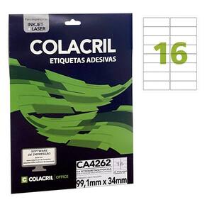 Etiqueta Adesiva Colacril A4 CA4262 99,1x34mm 25Fls As etiquetas Colacril podem ser utilizadas em casa ou no trabalho, assim mantendo a organização e a identificação. Ideal para uso em caixas, correspondências, documentos, pastas, pequenos objetos, código de barras, mala direta, encomendas, separação de materiais, arquivos, entre outros. - Marca: Colacril- Modelo: Etiqueta Adesiva- Referência: CA4262- Cor: Branco- Etiqueta retangular- Formato da folha: A4- Contém 400 etiquetas- 16 etiquetas por folha e 25 folhas por embalagem- Impressao: Inkjet e Laser- Dimensões da etiqueta: 9,91 x 3,4cm LxA - Composição: papel com adesivo acrílico