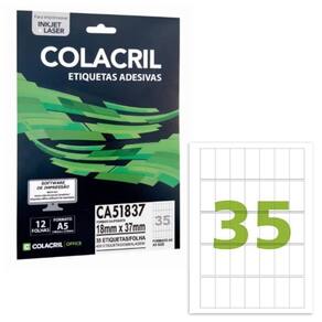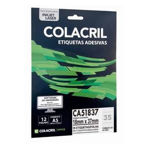 - Marca: Colacril - Modelo: Etiqueta Adesiva - Referência: CA51837 - Cor: Branco - Etiqueta retangular - Formato da folha: A5 - Contém 420 etiquetas - 35 etiquetas por folha e 12 folhas por embalagem - Impressão: Inkjet e Laser - Dimensões da etiqueta: 18,0mm x 37,0mm LxA - Composição: papel com adesivo acrílico