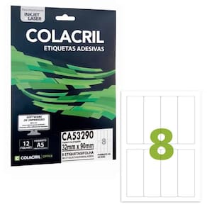 - Marca: Colacril - Modelo: Etiqueta Adesiva - Referência: CA53290 - Cor: Branco - Etiqueta retangular - Formato da folha: A5 - Contém 96 etiquetas - 8 etiquetas por folha e 12 folhas por embalagem - Impressão: Inkjet e Laser - Dimensões da etiqueta: 32,0mm x 90,0mm LxA - Composição: papel com adesivo acrílico Ean: 7897690109785