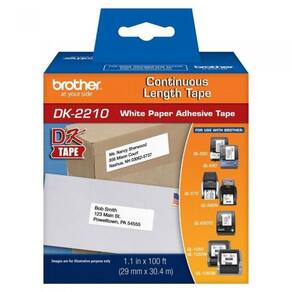 A etiqueta brother DK 2210 possui 29mm de largura e o rolo tem comprimento de 30,48m.