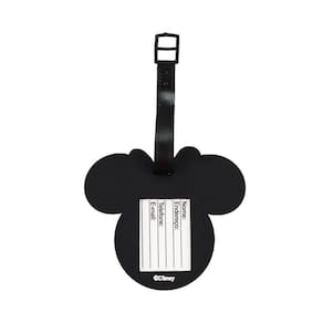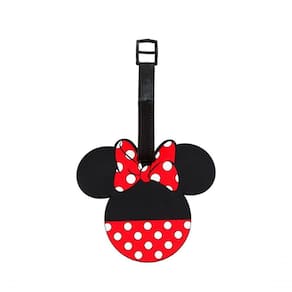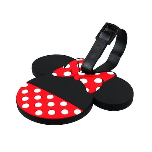 Etiqueta de identificação de bagagem no formato do rosto da Minnie. Interior com pequena folha para preencher nome, endereço, telefone e email. Material: silicone