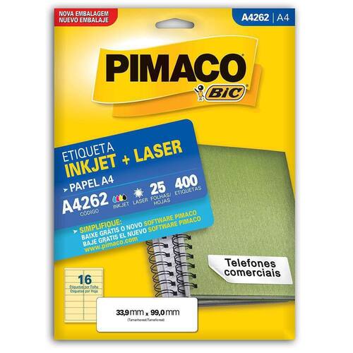 Etiqueta Pimaco A4 25 Folhas A4262 33,9mmx99mm- Modelo: A4262- Tamanho da Etiqueta: 33,9mm x 99mm- Quantidade por Folha: 16 Etiquetas- Tamanho da Folha: A4- Embalagem com 25 FolhasEtiqueta adesiva, modelo A4262. Possui 25 folhas com 16 etiquetas em cada. Ideal para organização e identificação de vários itens em casa ou no trabalho.