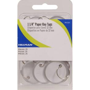 Hillman 701331 Aro, 3,2 cm de diâmetro, fenda de metal, branco, 25 chaves, etiqueta de papel de identificação com anel, 3,5 cm, pacote com 25