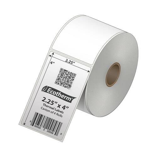 Ecotherm 2,25 x 4 etiquetas térmicas diretas em um rolo - O diâmetro do núcleo do rolo é de 2,5 cm - O diâmetro externo do rolo não excede 10 cm - Compatível com impressoras Zebra: ZD220, ZD410, ZD411, ZD421, ZD620, ZD621, GC420, GK420, GX430, LP2824, LP2844, ZP500. - Resistente à luz UV. Temperatura de serviço: -4F a 158F. Qualidade de impressão: impressão clara e de alto contraste sem manchas ou desbotamento ao longo do tempo. - Fácil de descascar: com um adesivo permanente à base de borracha de alta aderência para caixas, papelão, vidro, caixas onduladas, paletes, metal, papel, plástico bolha, sacos de poliéster, embalagem retrátil e correspondências. - Segurança: as etiquetas térmicas Ecotherm Direct são livres de BPA, garantindo que sejam seguras para uso em embalagens de alimentos e outras aplicações onde a segurança do produto é uma preocupação. - As aplicações incluem: etiquetas de envio, etiquetas de preço, etiquetas de código de barras, etiquetas de inventário, etiquetas FBA, etiquetas de endereço, etiquetas de pasta de arquivo, etiquetagem em processo de trabalho e muito mais