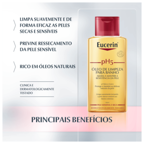 Ideal para peles secas e sensíveis, o Eucerin pH5 Óleo de Banho não deixa uma sensação pegajosa na pele, perfeito para completar a sua rotina de limpeza e proteção diária.