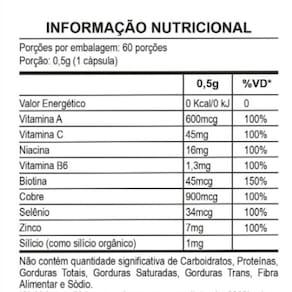 Evolue cabelos e unhas frasco com 60 capsulas Descrição do anúncio 1x- cabelos e unhas com 60 cápsulas - evolue Composição do anúncio É um suplemento nutricional que oferece diversos benefícios para a saúde da pele, cabelos e unhas. Benefícios: -pele: a vitamina b3 e a vitamina b6 contribuem para a manutenção da pele. -pigmentação: o cobre contribui para a pigmentação de cabelo e pele. -antioxidante: a vitamina c, cobre, zinco são antioxidantes que auxiliam na proteção dos danos causados pelos radicais livres. -suporte à imunidade: a vitamina a, vitamina b6, vitamina c, o cobre e o selênio auxiliam no funcionamento do sistema imune. -cabelos: a biotina e o zinco contribuem para a manutenção do cabelo. -unhas: o zinco contribui para a manutenção das unhas. Recomendação de uso: consumir uma cápsula 1 porção uma vez ao dia. Não contém glúten. Não contém lactose. Advertências: produto indicado para maiores de 19 anos. Este produto não é um . Este produto não deve ser consumido por gestantes, lactantes e crianças. Não exceder a recomendação diária de consumo indicada na embalagem. Marca: Não Informado Ean: 7898716042239