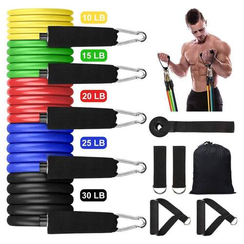 - 05 Extensores Elásticos - cada um oferecendo uma resistência - 02 Alças de Punho ou Tornozelo; - 02 Puxadores Ergonômicos; - 01 Âncora de porta; - 01 Bolsa de Transporte e Armazenamento; Marca: Monac