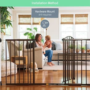 Summer Infant Portão de segurança extra largo de metal para animais de estimação e bebês, 112 cm a 180 cm de largura, 91 cm de altura, ferragens montadas para segurança de cães e crianças, serve para - Summer Metal Expansion Extra Wide Safety Dog and Baby Gate serve em aberturas de 112 a 182 cm de largura e 91 cm de altura; meça a abertura antes de comprar para garantir o ajuste adequado - Serve para portas ou corredores extra-largos com kit de ferragens incluído; ferramentas necessárias para instalação de hardware (não incluídas): broca, chave de fenda, lápis, fita métrica - A porta de 48 cm de largura permite que os pais se movam facilmente de cômodo em cômodo e podem se abrir em qualquer direção; os adultos podem abrir facilmente o portão com uma mão deslizando o gatilho e levantando o painel da porta para cima - A porta trava com segurança para manter bebês, crianças pequenas e animais de estimação contidos com barras de 6,9 cm estreitamente espaçadas que impedem que eles se apertem; o protetor de arranhões macio no trilho inferior protege pisos de ferragens - Para limpar a superfície com um pano úmido usando detergente neutro e água morna; observe que o portão não caberá em uma abertura de 129 a 132 cm ou 154 a 157 cm; segurança de terceiros testada e aprovada