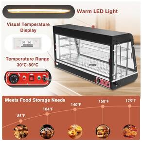 Ficha Técnica Especificação Detalhes Marca Anpuce Cor Preto Material Aço Inoxidável, Vidro Temperado Dimensões (Comprimento) 69 cm Peso do Item 28 kg Número de Prateleiras 3 (Removíveis e Ajustáveis) Portas Frontal e Traseira Corrediças Iluminação LED Brilhante Tanque de Água Base (para retenção de umidade) Fonte de Energia Elétrica com Cabo Potência 1200 W Temperatura Mínima 30°C Temperatura Máxima 80°C Voltagem 110 volts Marca: Não Informado