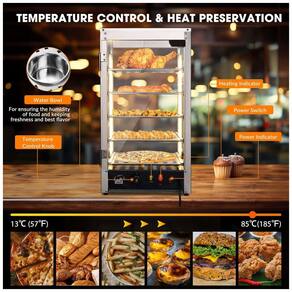 O Expositor Aquecedor de Alimentos Comercial WeChef 5 Andares de 600W oferece 5 prateleiras para armazenamento otimizado, compatível com pizzas de até 28 cm por nível, economizando espaço no balcão em cafés, conveniências e estabelecimentos comerciais. Controle de temperatura termostático com knob rotativo ajusta de 14°C a 85°C, mantendo calor constante e protegendo contra superaquecimento para operação precisa em ambientes de alto volume.