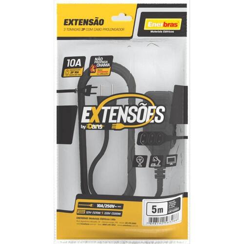 1.Extensão 3 tomadas 2p 10a/250v preto 5 metros bivolt - enerbras - ext-e003