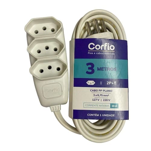 Informações adicionais do produto: Cores: Branco Cabo: Cordão Paralelo Flexível 2x0,75mm² 300 V Tomadas: Três tomadas em Polipropileno, terminais em latão Plugue: PVC com pinos em latão niquelado, separador em nylon Plugue e Tomadas: 3 Pinos Corrente Máxima: 10 A