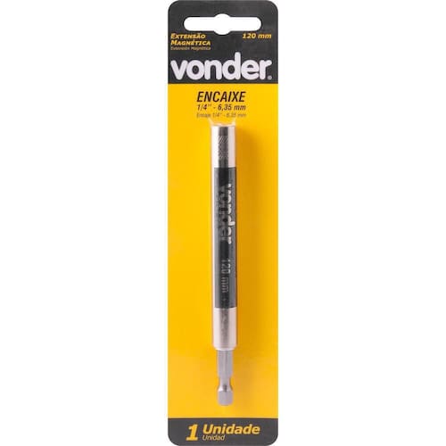 EXTENSAO MAGNETICA 1/4 120MM VONDER A extensão proporciona praticidade para lugares de difícil acesso. Possui encaixe magnético e funciona como guia em lugares aonde o furo é mais espesso. Utilizada em parafusadeiras para apertar ou soltar parafusos de acordo com o bits utilizado não acompanha bits . Material: Aço carbono Acabamento da extensão: Cromado brilhante Medida do encaixe: 1/4 Comprimento estendido: 200 mm Comprimento fechado: 120 mm Marca: Não Informado Ean: 7893946644390