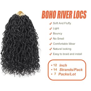 Short Goddess Locs crochê cabelo 35,5 cm River Locs Boho Hippie Locs ondulado crochê com cabelo encaracolado no meio e extremidades tranças extensões de cabelo (7 pacotes, 30,5 cm, 1B) - 1. Material: 100% extensões de cabelo, nova extensão de trança de cabelo de crochê Goddess Locs com encaracolado profundo no meio e nas pontas. - 2. Características: Nova moda, visual moderno e ousado, natural e charmoso. Em comparação com as deusas locs, os river locs são mais adoráveis e completos. Um fio com 2-3 cabelos encaracolados. - 3. Estilo: cabelo trançado de crochê River Locs Goddess. Bonito e moderno, muito fofo, lindos cachos terminam, sentindo-se como uma deusa, parecendo uma rainha. - 4. Tamanho: 30,5 cm de comprimento, Peso: 42 g, Cor: 1B. Fios: 14 fios/pacote, 7 pacotes/lote (98 fios/lote). Vem com uma agulha de crochê . - 5. Vantagem: muito leve, sem cheiro, não é fácil de separar, fácil de instalar, cabelo bonito e aparência natural, o cabelo de crochê Goddess Locs é adequado para mulheres de todas as idades. Os pontos falsos seguram bem, adequados para uso diário, natação, atividades ao ar livre, festa, cosplay, apresentação, presente, casamento, etc.