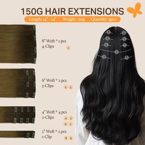 - Extensões de cabelo 150 g de peso – Super espesso: cada conjunto inclui 9 peças com 20 clipes, pesando 132 g sem clipes e 150 g com clipes. Melhoramos a versão autêntico de 120 g adicionando 2 peças de trama de 2 clipes. Um pacote adequado para a maioria das necessidades