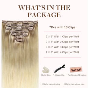 Conjuntos de cabelo: trama de 2,5 x 20,3 cm de largura, 4 clipes presos, trama de 5 x 15 cm de largura, 3 clipes anexados, trama de 5 x 10 cm de largura, 2 clipes anexados, trama de 5 x 5 cm de largura com 1 clipe.