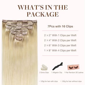 Extensões de cabelo com clipes: conjunto de 7 peças de 120 g. Peso líquido de 105 g para cabelo sem clipes, 120 g para cabelo com clipes. Um conjunto para cabelos grossos, dois conjuntos para cabelos finos. Se você quiser adicionar comprimento e volume, recomendamos que você escolha 2 conjuntos.