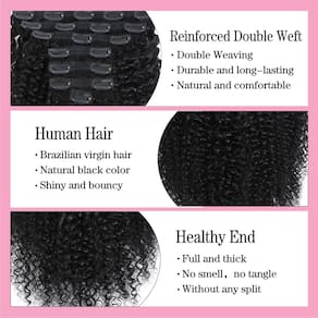 - Material do cabelo: Clipes encaracolados crespos feitos de cabelo humano virgem brasileiro, você pode ser tingido, permanente, branqueado, enrolado.